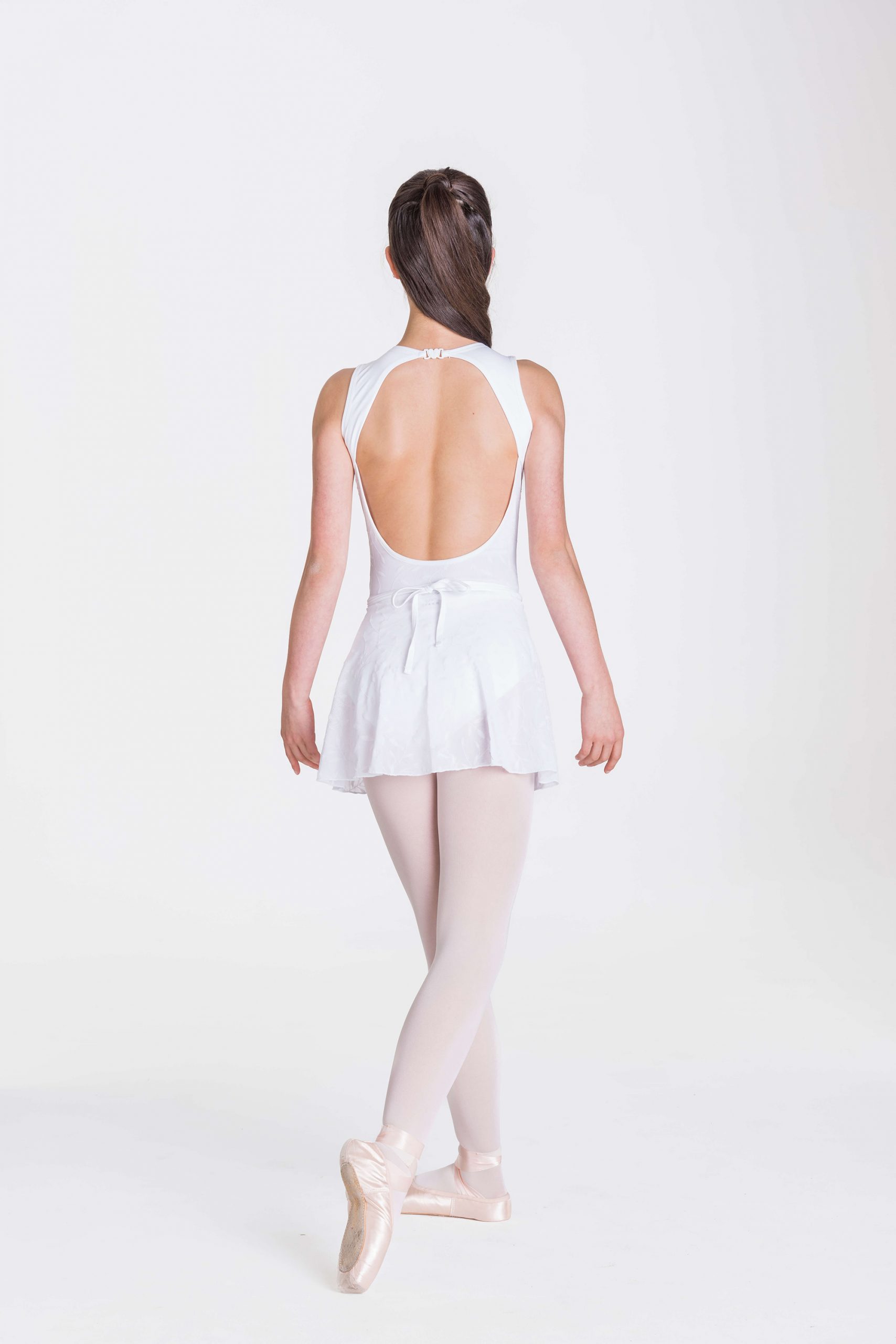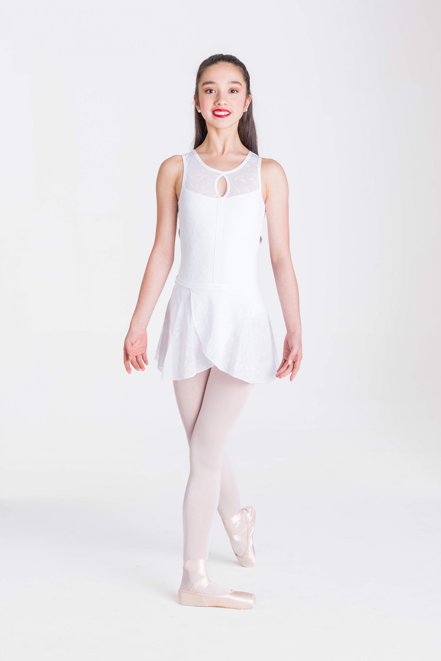 The Alexa Wrap Skirt is a beautiful ballet skirt with a delicate velvet leaf print design on soft mesh, and comes in black or white.