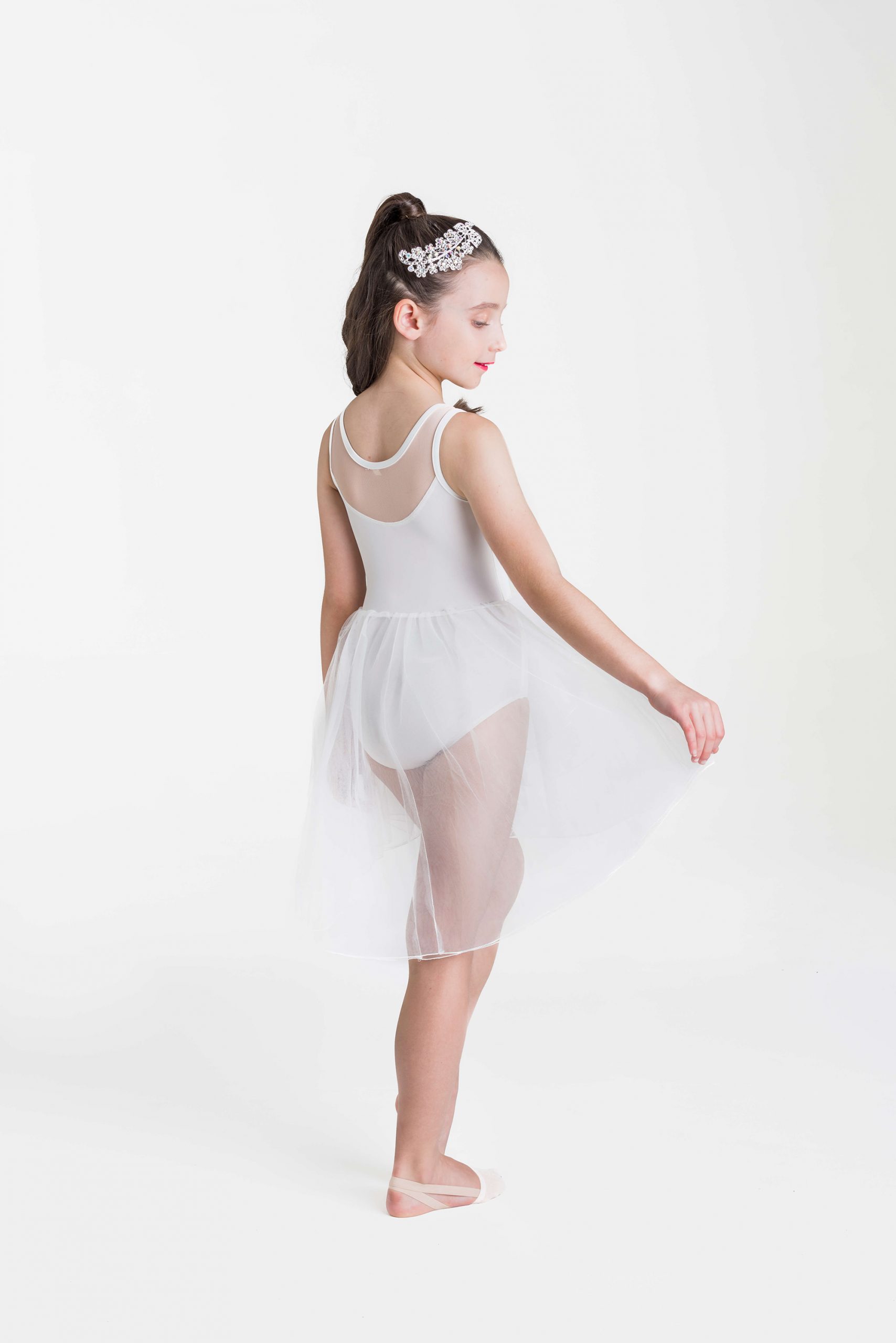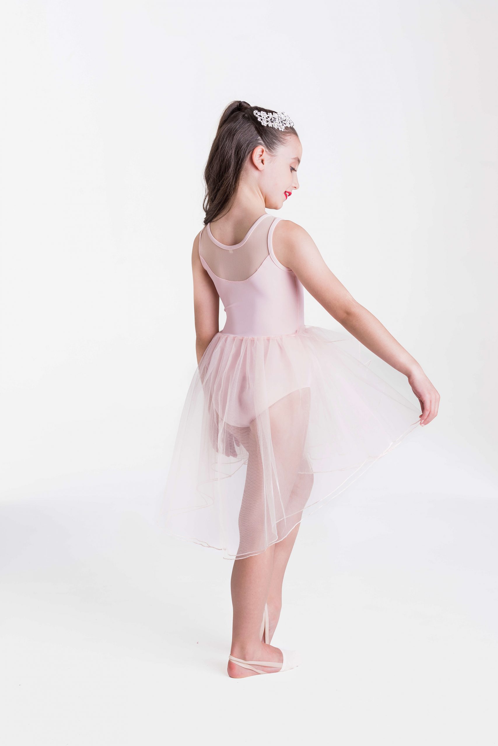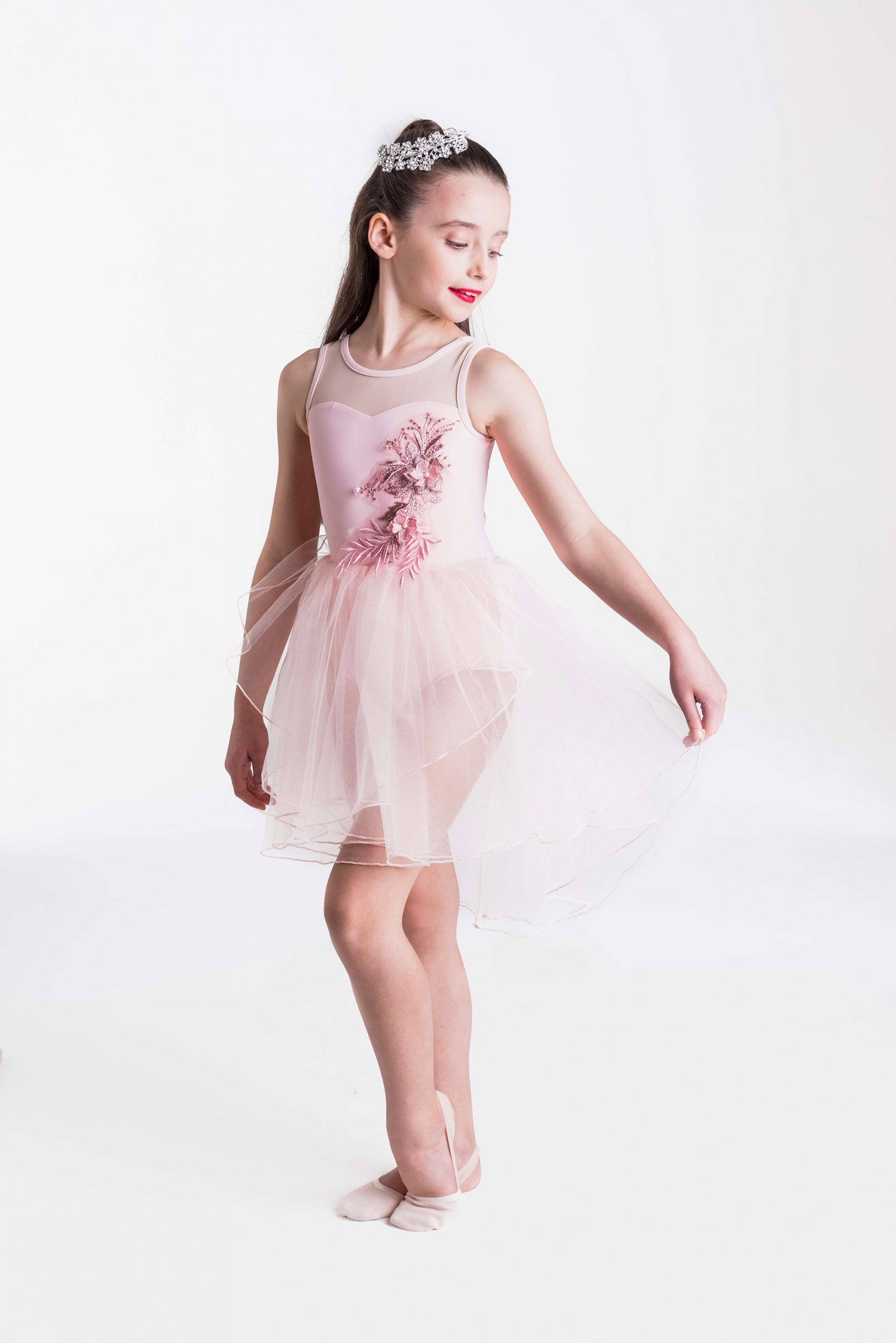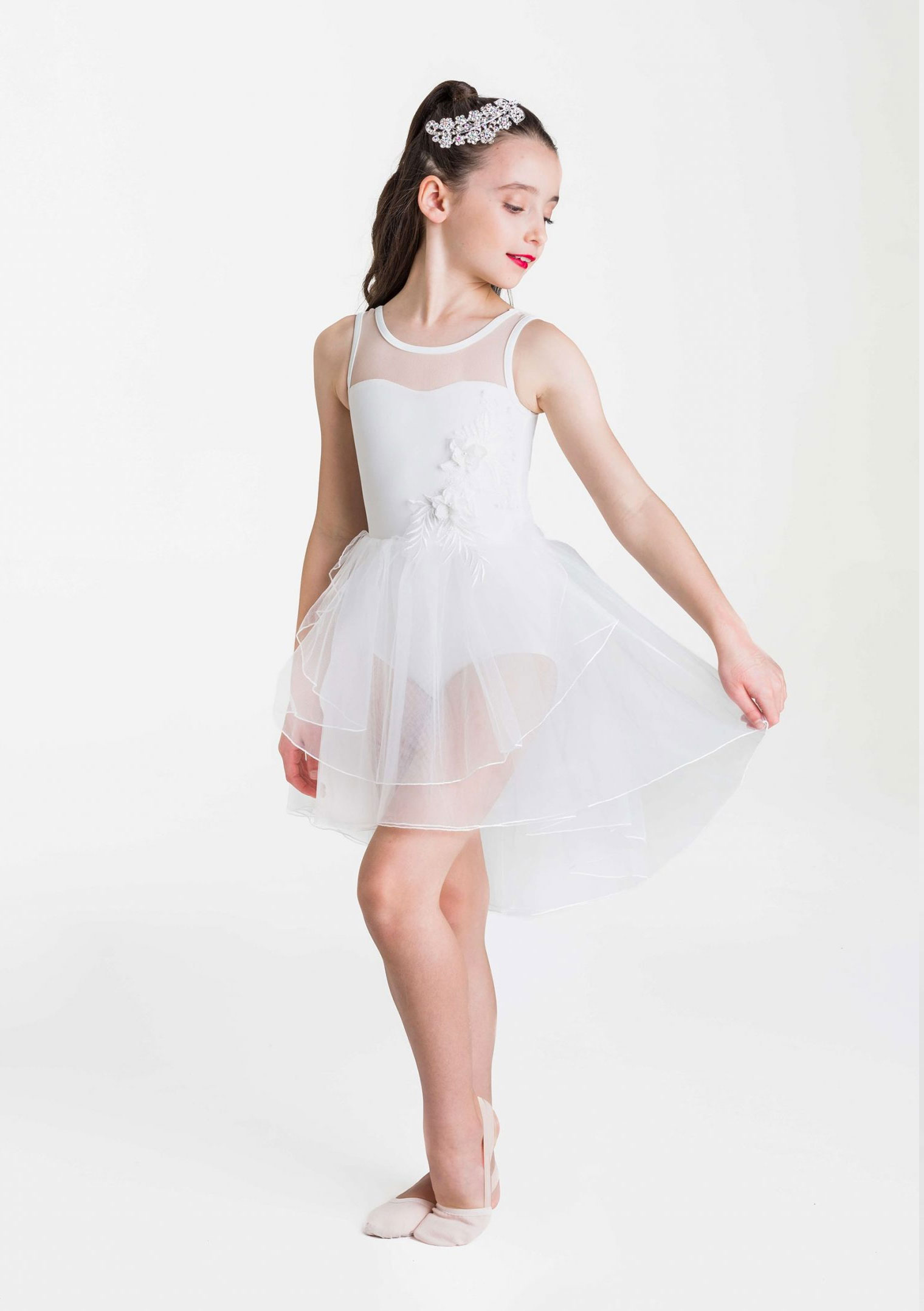 The Angelic Lyrical Dress is a delicate lyrical costume with a mesh illusion sweetheart neckline, flower applique and a high-low tulle skirt. Stunning both on and off the stage, this lyrical costume would be perfect on every dancer.