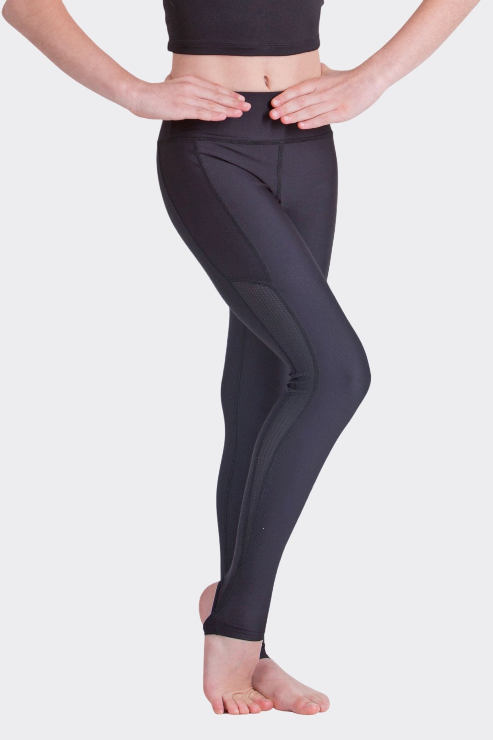 The Caitlin Leggings are comfortable stirrup leggings with honeycomb-textured mesh panels. Ideal for dance and workouts.