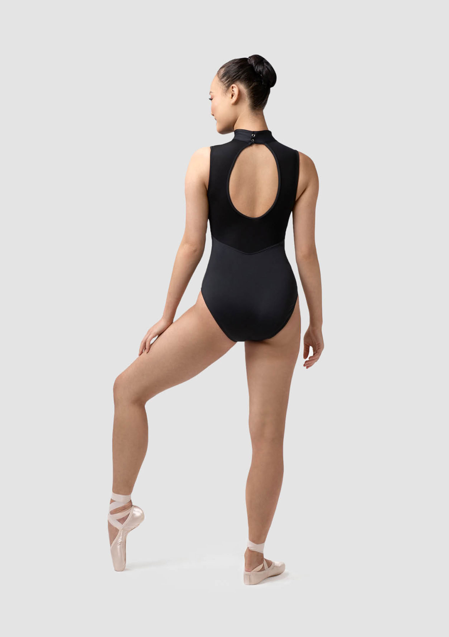 Polyester/Spandex, textured Nylon mesh, lined. A high front and neckband with back press studs. Spliced front and back keyhole detail.