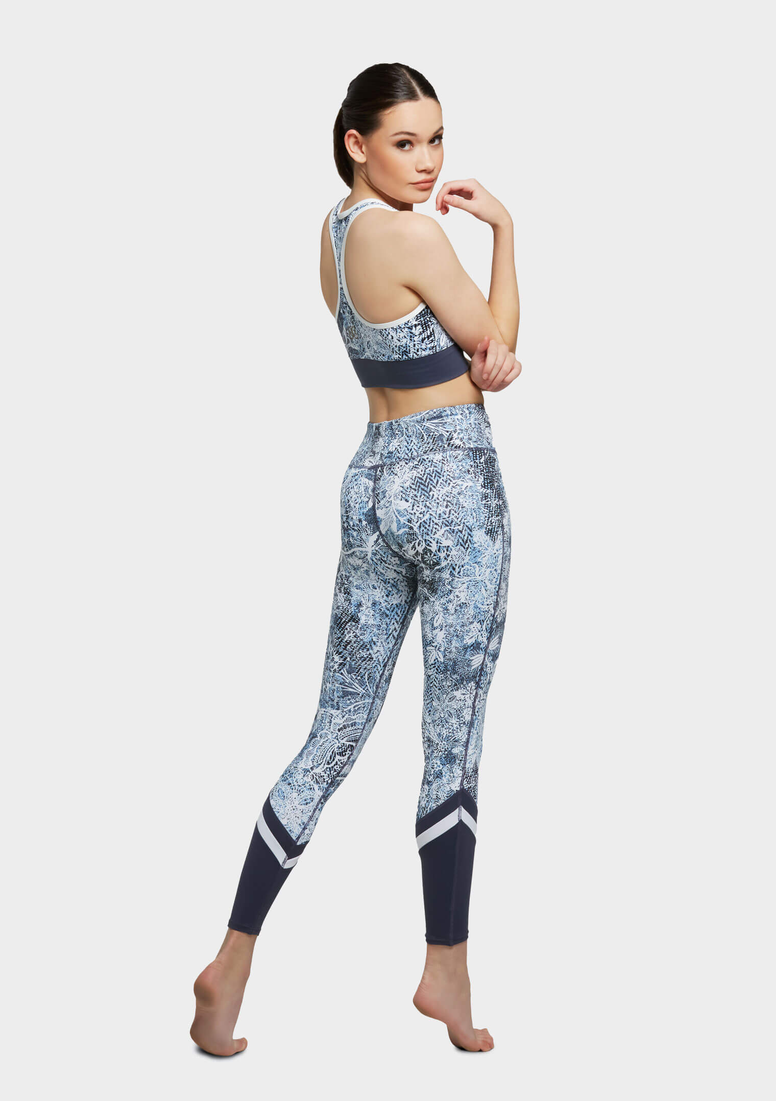 Our beautiful Erika Leggings are an eye catching 7/8 length with high waisted band. Features include spliced contrast leg panels, double layer waist band and flat seams, all in a unique fabric.