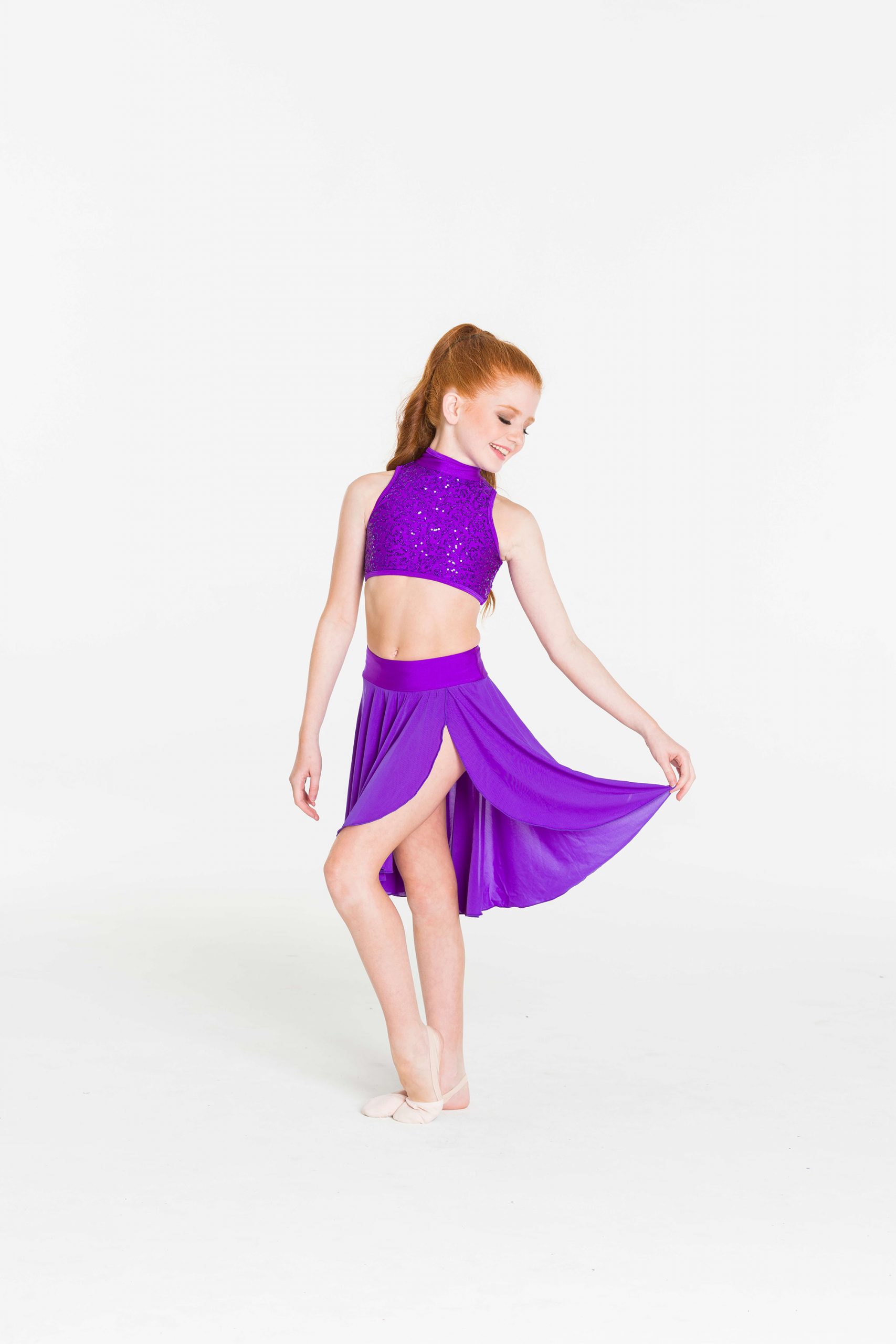 A beautiful flowing diagonal front mesh skirt with high waisted dance brief, in a range of colours for your contemporary or lyrical performance.