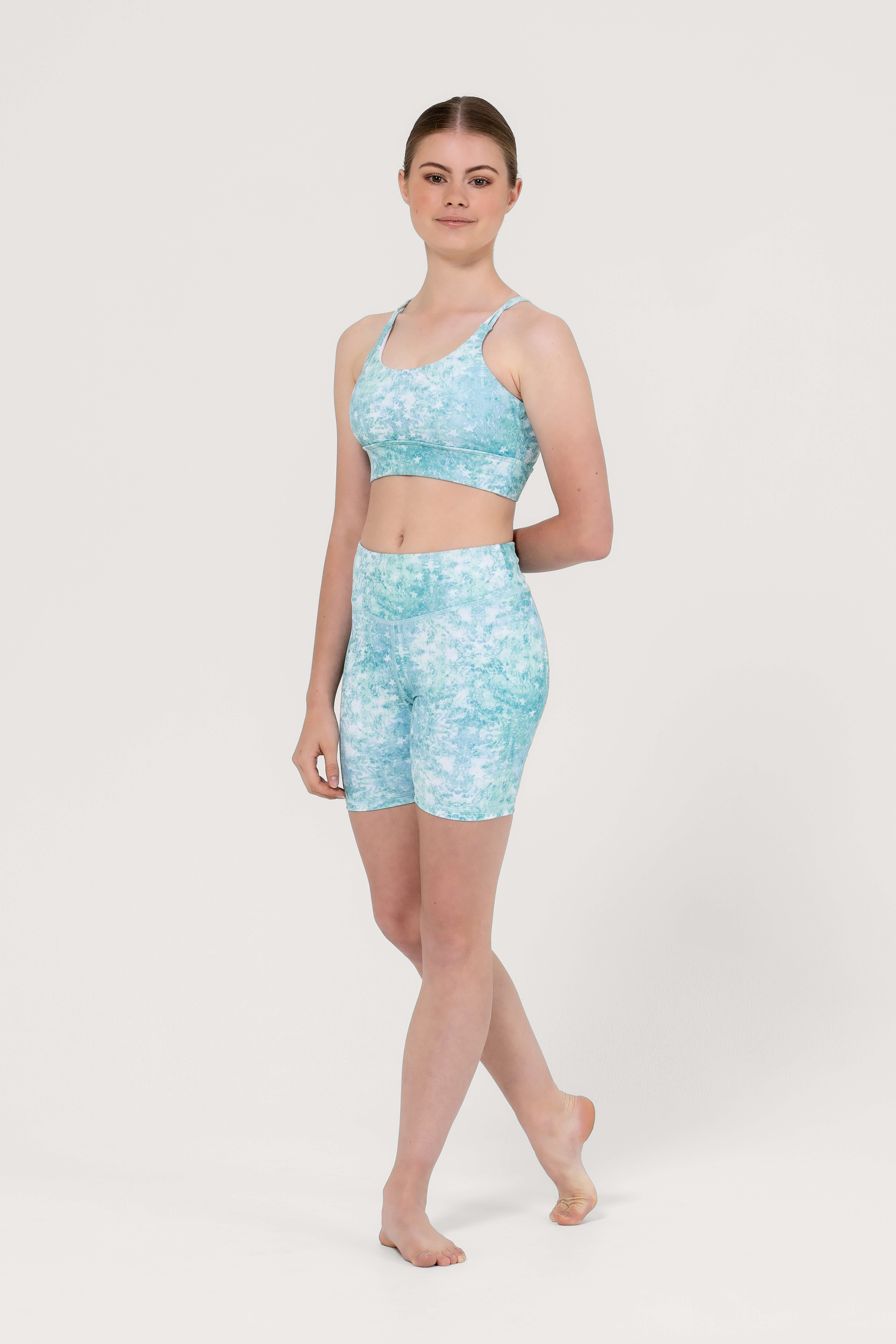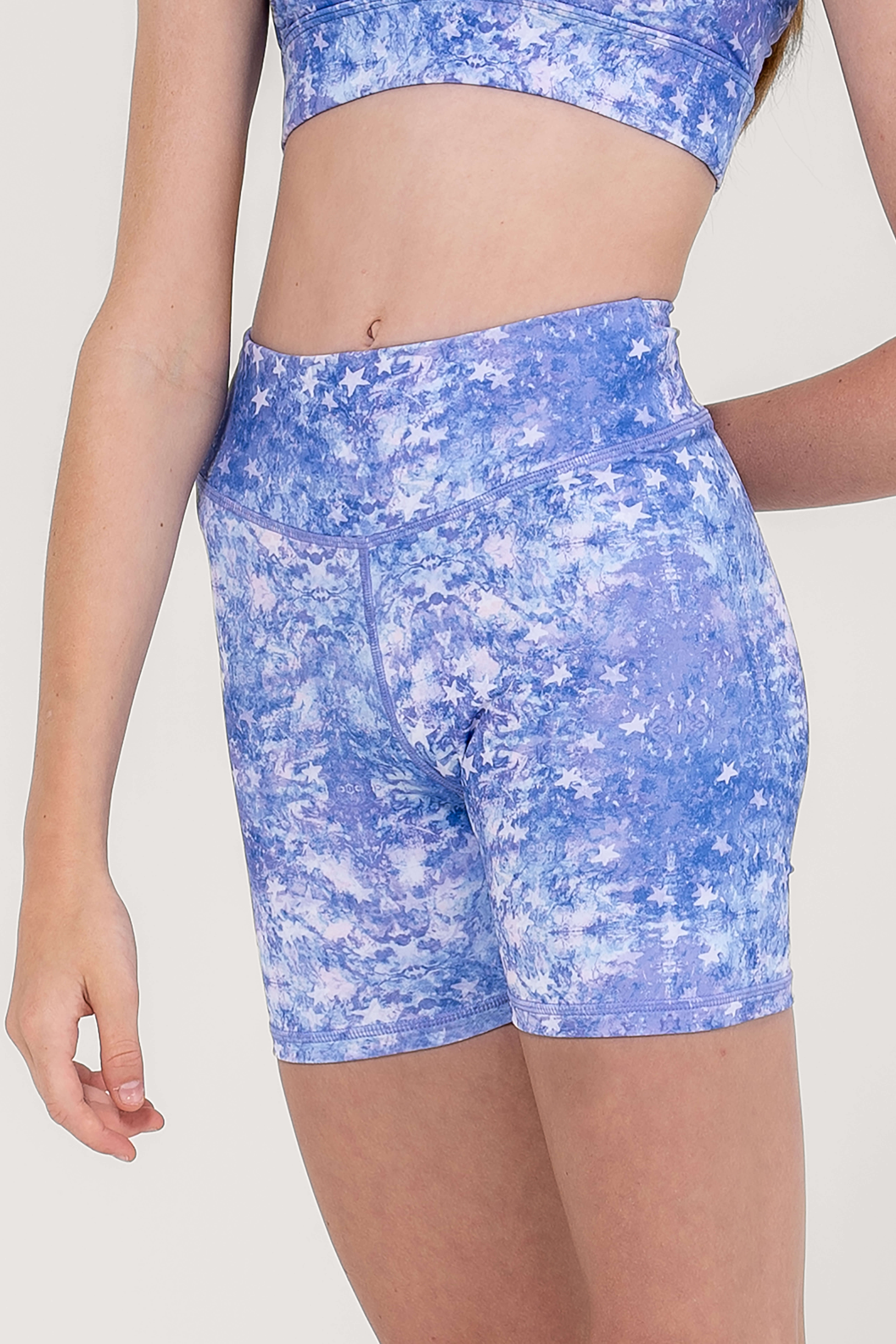 These high waisted bike shorts feature a wide double layer waist band.