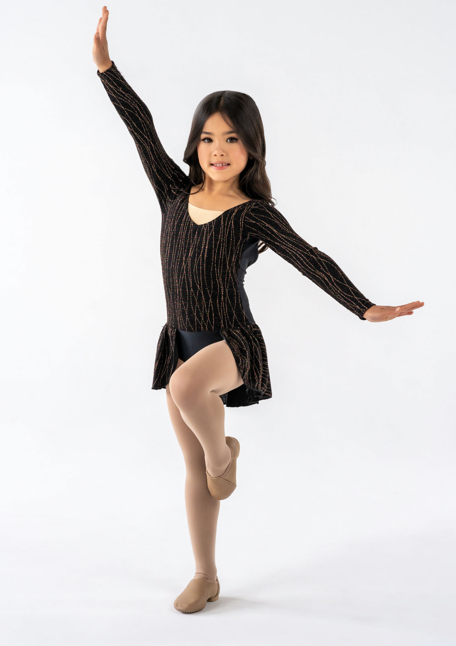 The beautiful Kelly Dress features a scooped back line, long sleeves and mini skirt. Perfect for the little tap or jazz dancer. The fabric features multicolour sparkling threads that will have you shining under the lights.