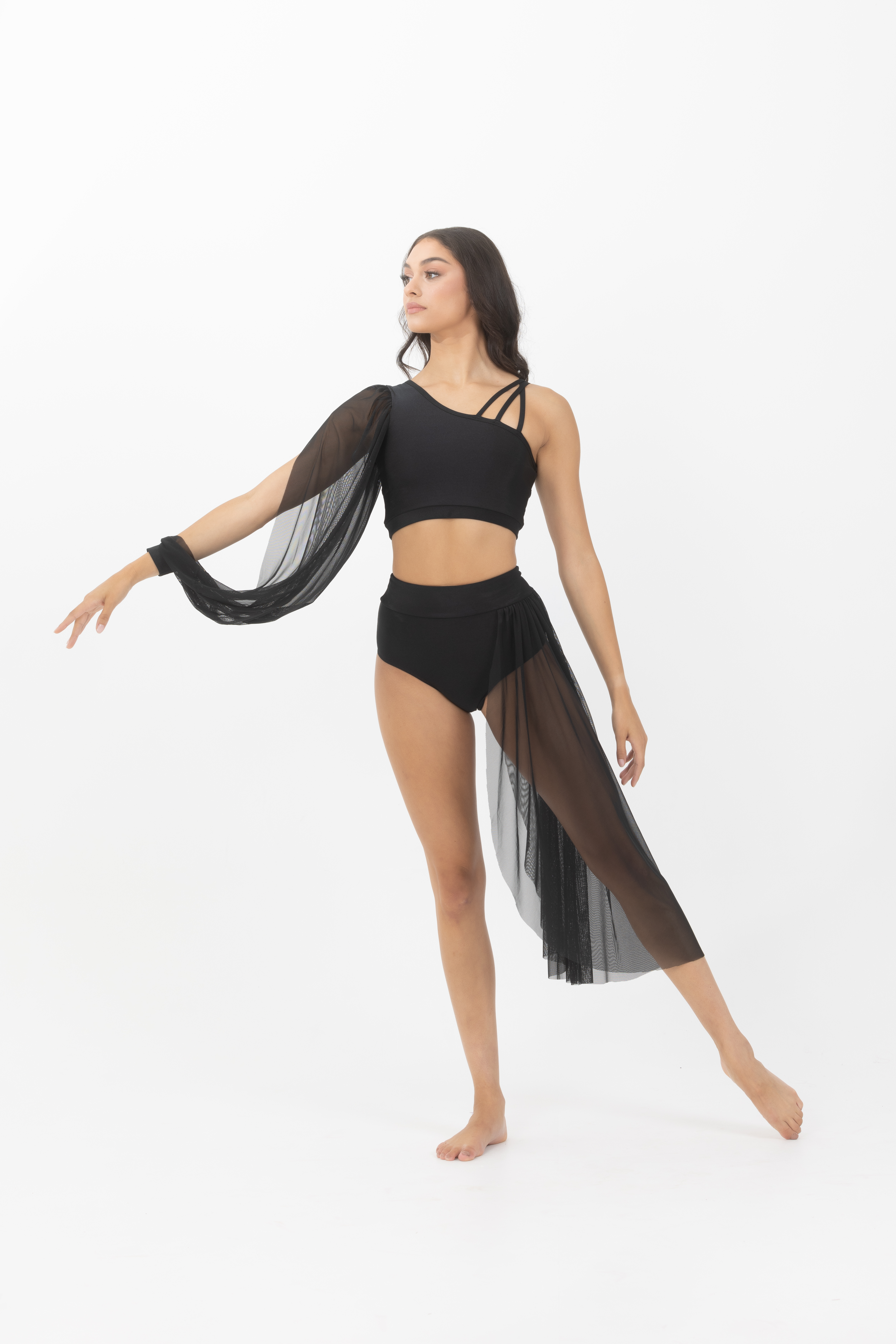 This stunning two-piece lyrical set features a one-sleeve slit design and three connected straps on the opposite shoulder. The briefs have a wide waistband and long side mesh panel. Choose between Black, Breeze Blue, Burgundy, Copper, Moss, Rose, and White.