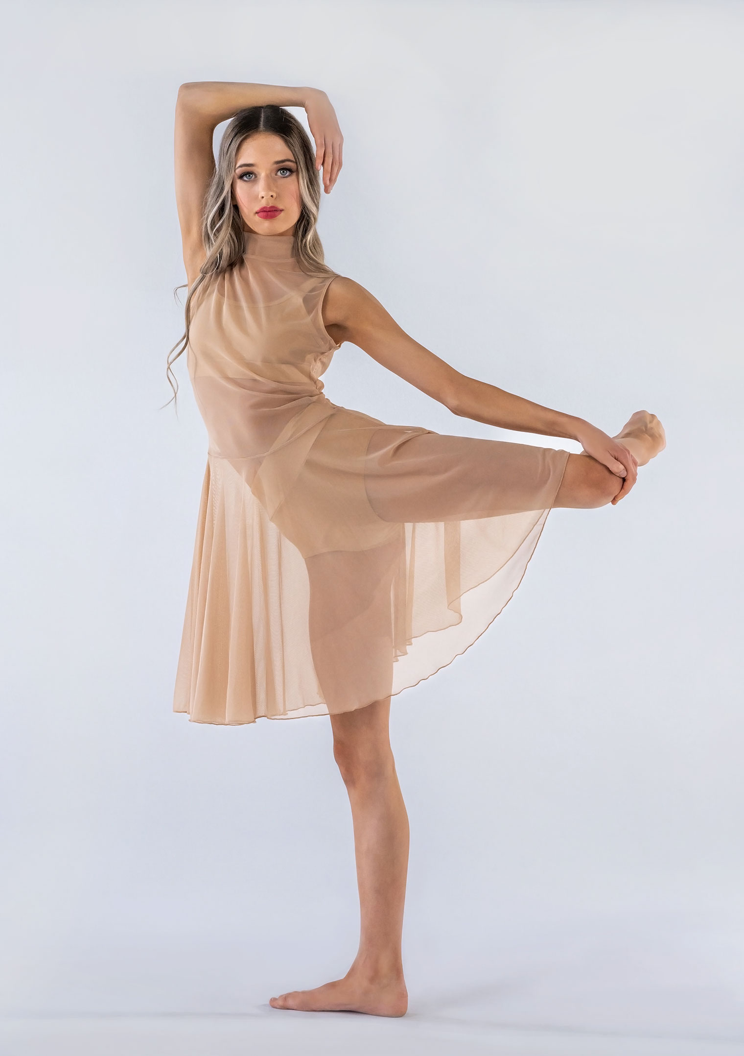 A striking design for the modern performer. The Mesh Performance Dress features a high neck line, transitioning into a gathered skirt.