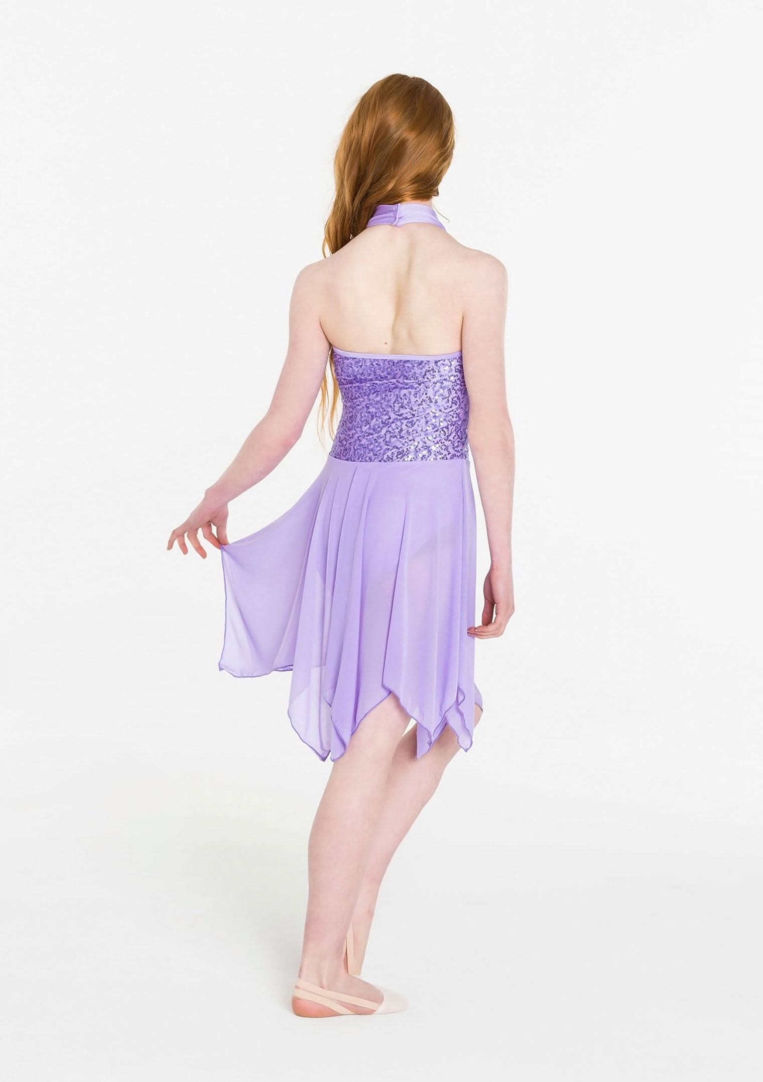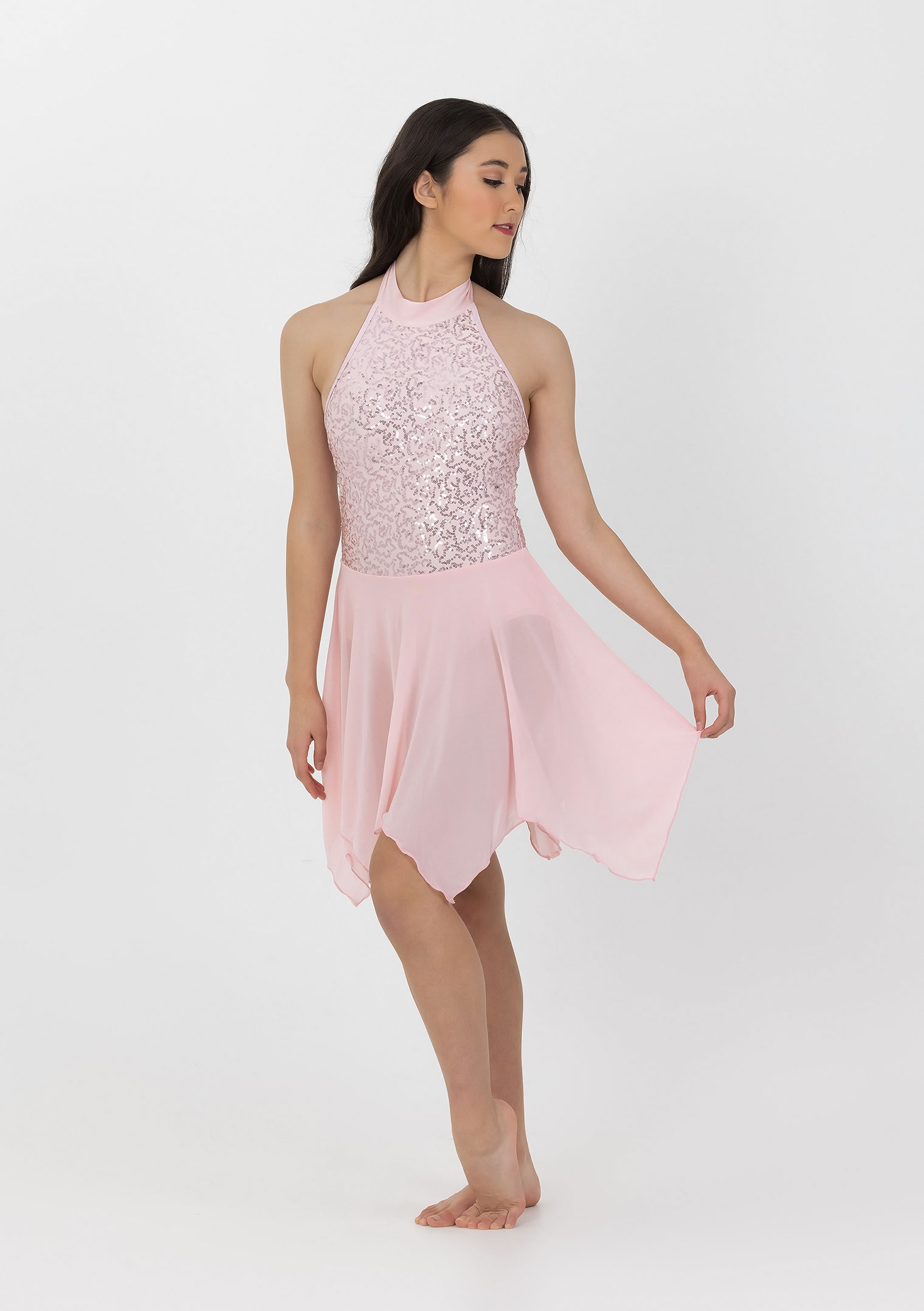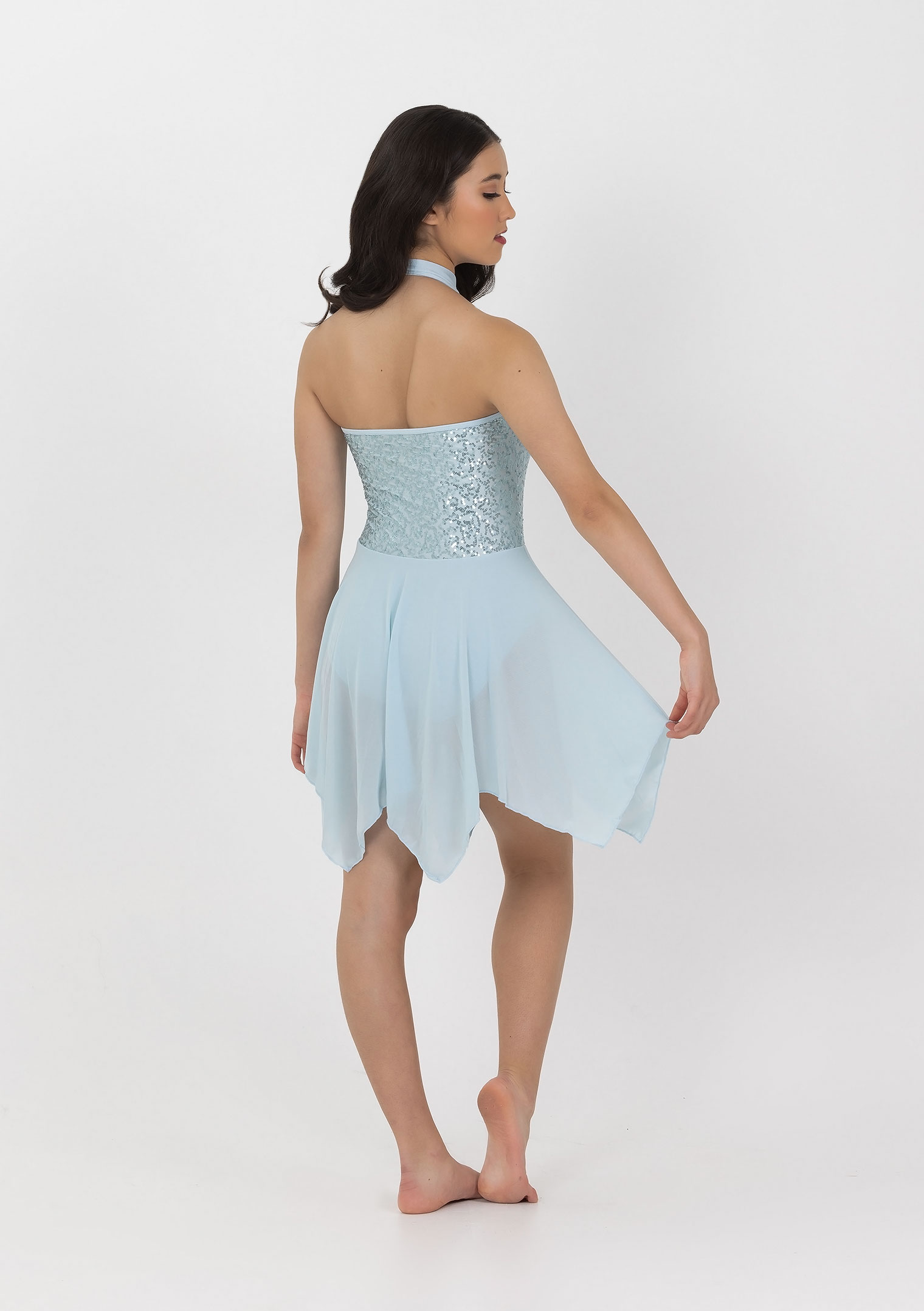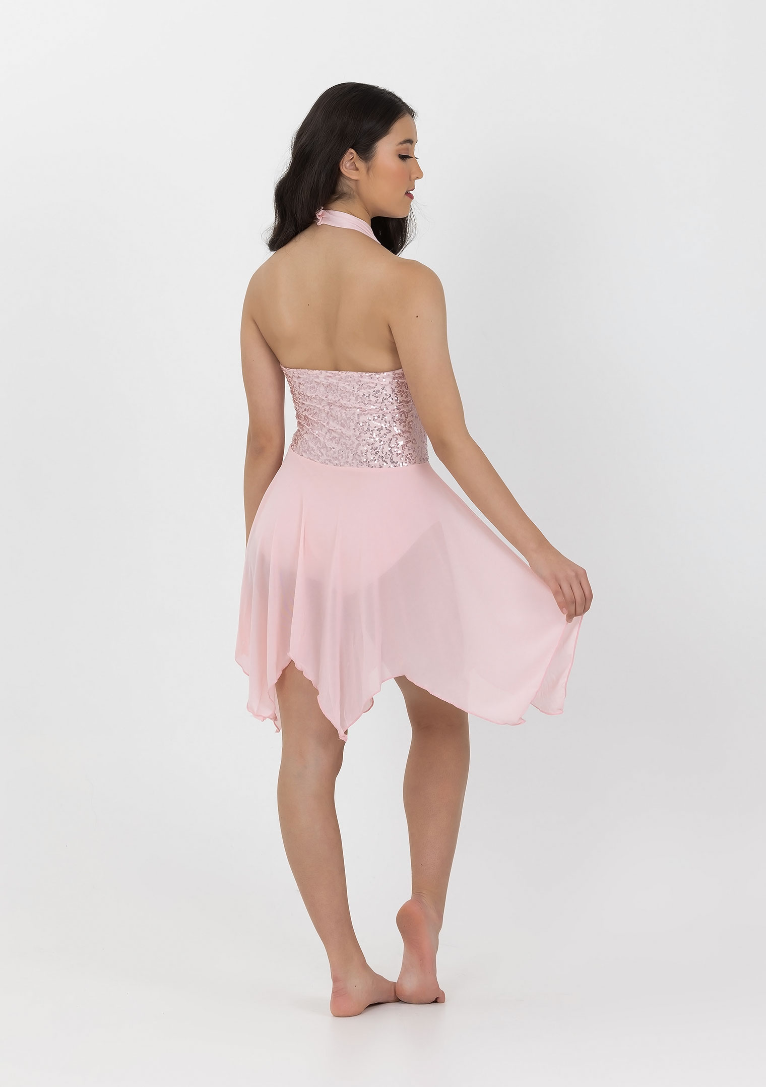 A stunning take on a classic lyrical dress. Our Pastel Essence Dress is a sparkling lyrical costume with a halter neck, sequinned bodice, and soft mesh skirt with an asymmetrical hem. Available in four pastel colour, this dress is sure to flatter any dancer!