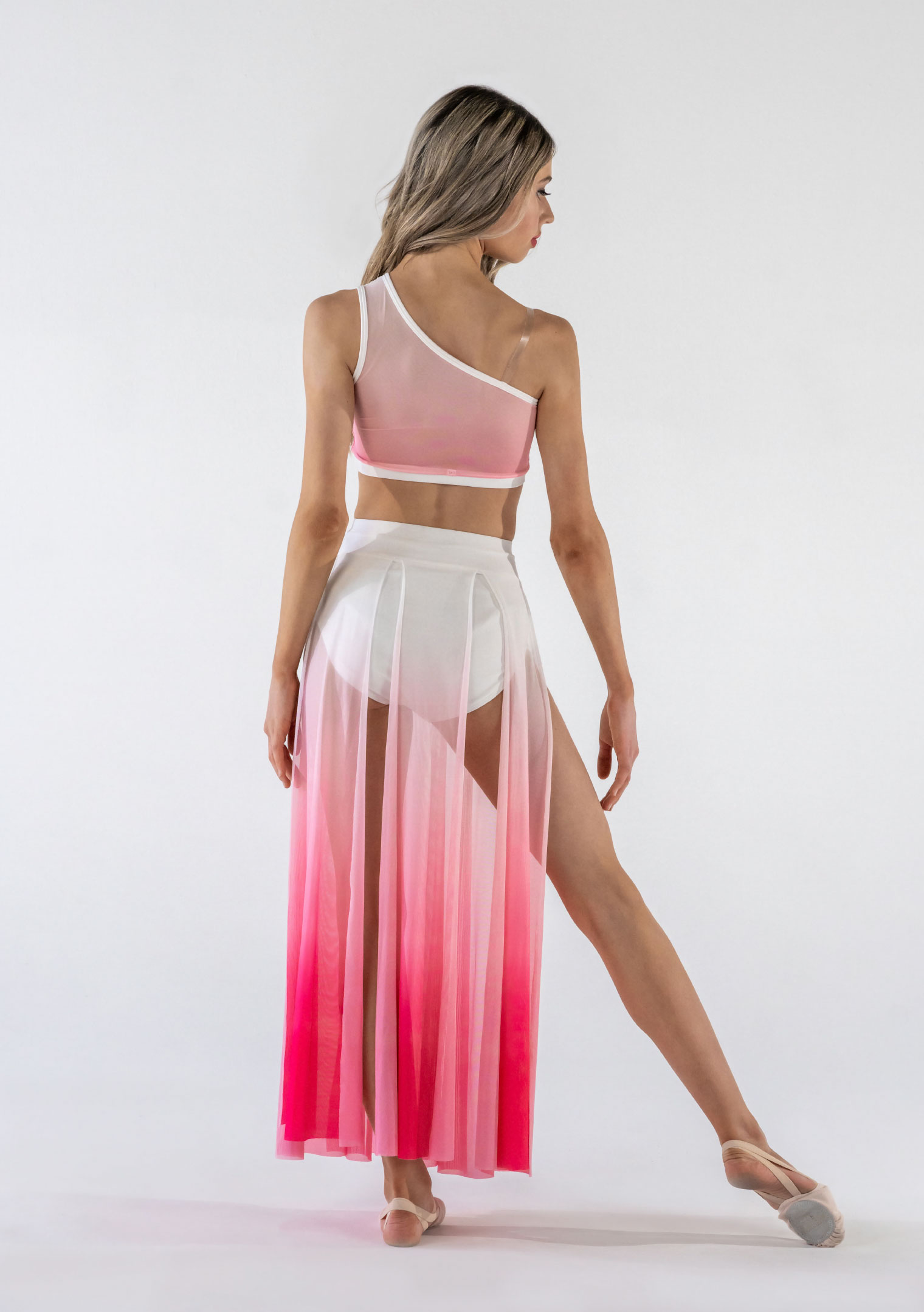 This beautiful ombré 2-piece set features a stunning draped panel skirt and one shoulder crop design. The perfect costume to compliment your lyrical or contemporary performance.