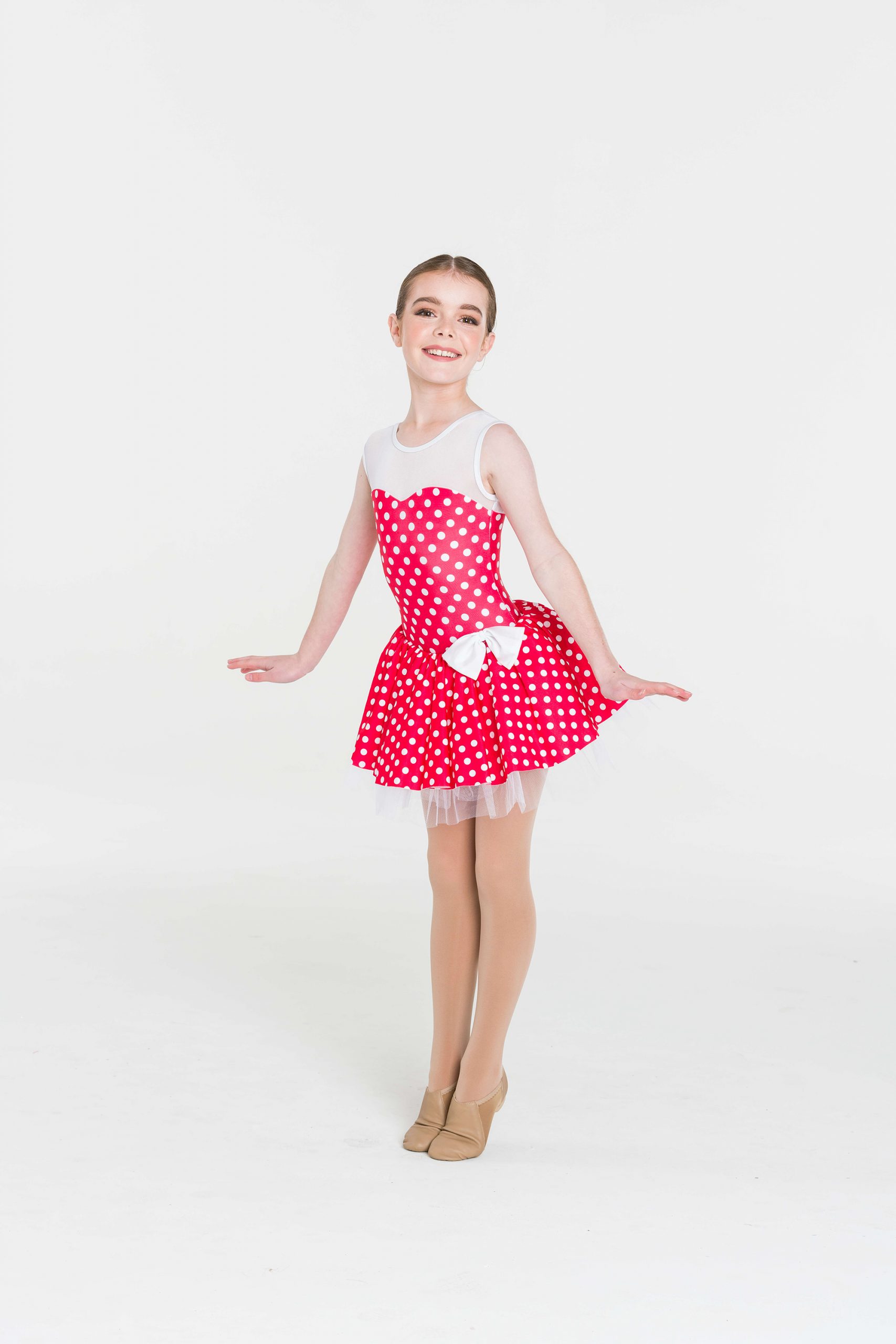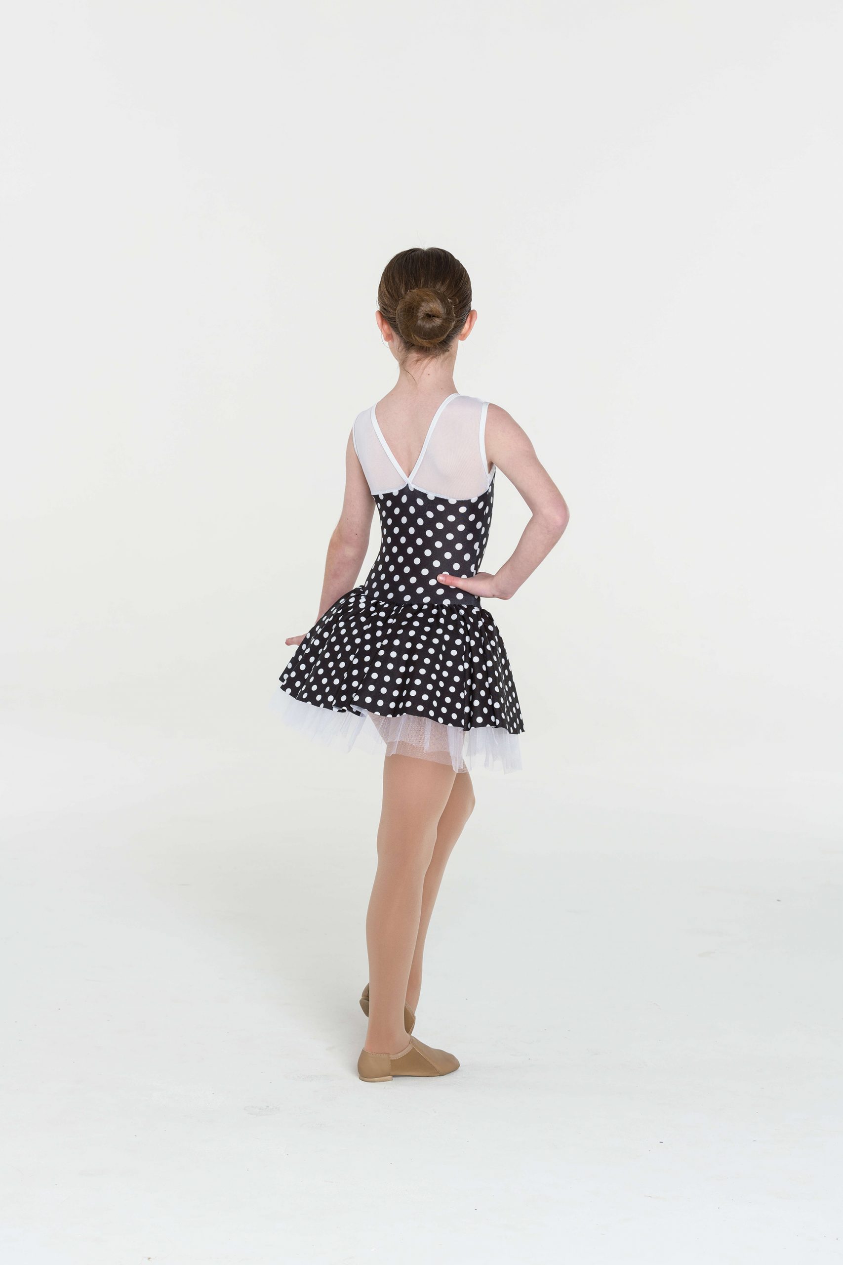 Polyester/Lycra, mesh, tulle skirt. Contrasting white polka dots, except Navy, which has multi-colour dots.