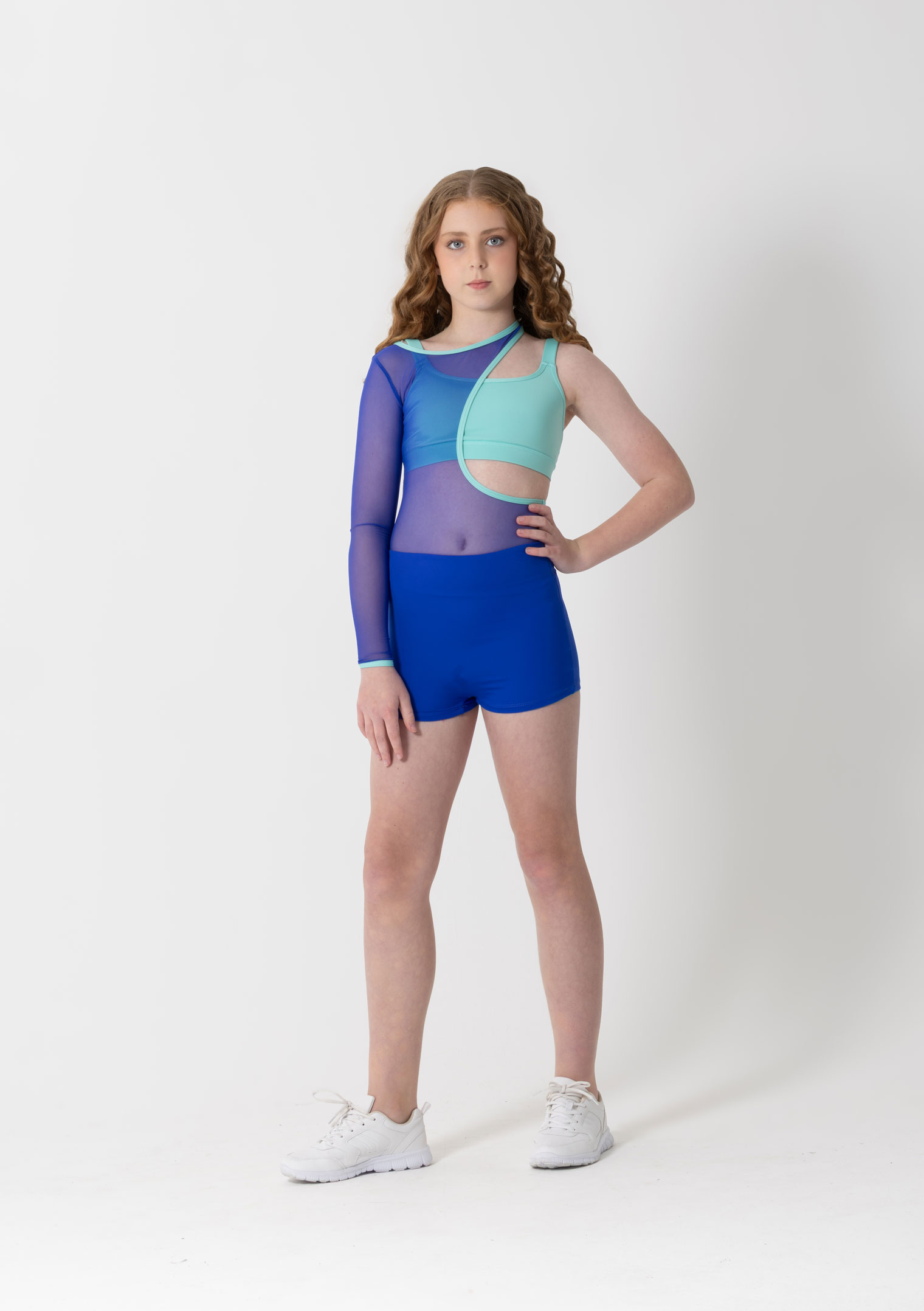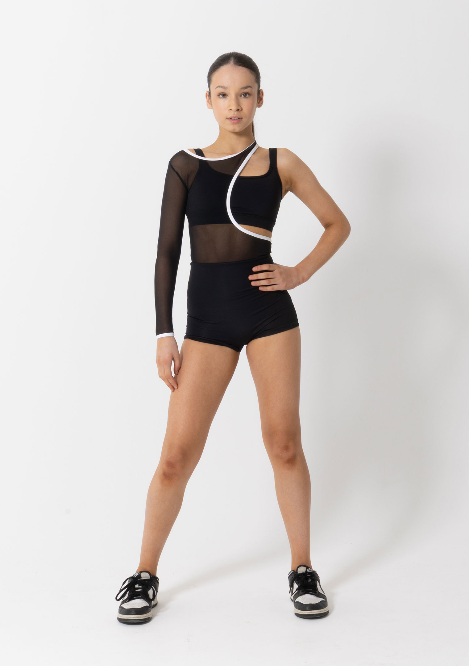 The Tammy Biketard is a statement piece that blends bold design with everyday functionality. Featuring a dramatic all mesh top with circular cut-out on one side and a single mesh sleeve on the other, this biketard plays with contrast and structure to create a powerful silhouette. Pair it with any crop underneath to style it your way.