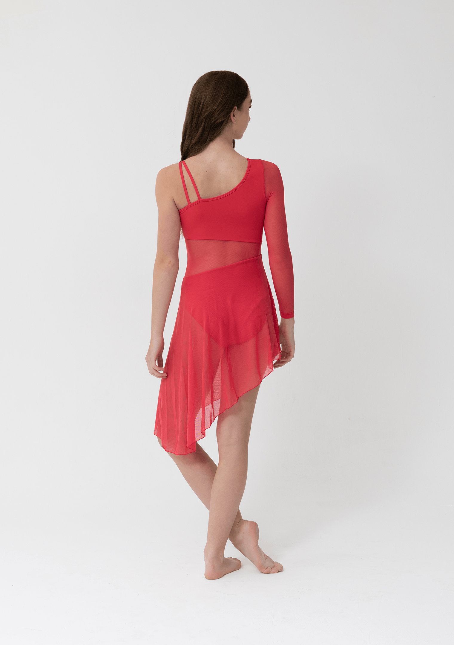 A single long mesh sleeve offers graceful coverage on one arm, while the opposite side showcases an elegant double-strap detail. The asymmetry continues through the skirt, where soft mesh drapes diagonally for beautiful movement that mirrors your choreography.