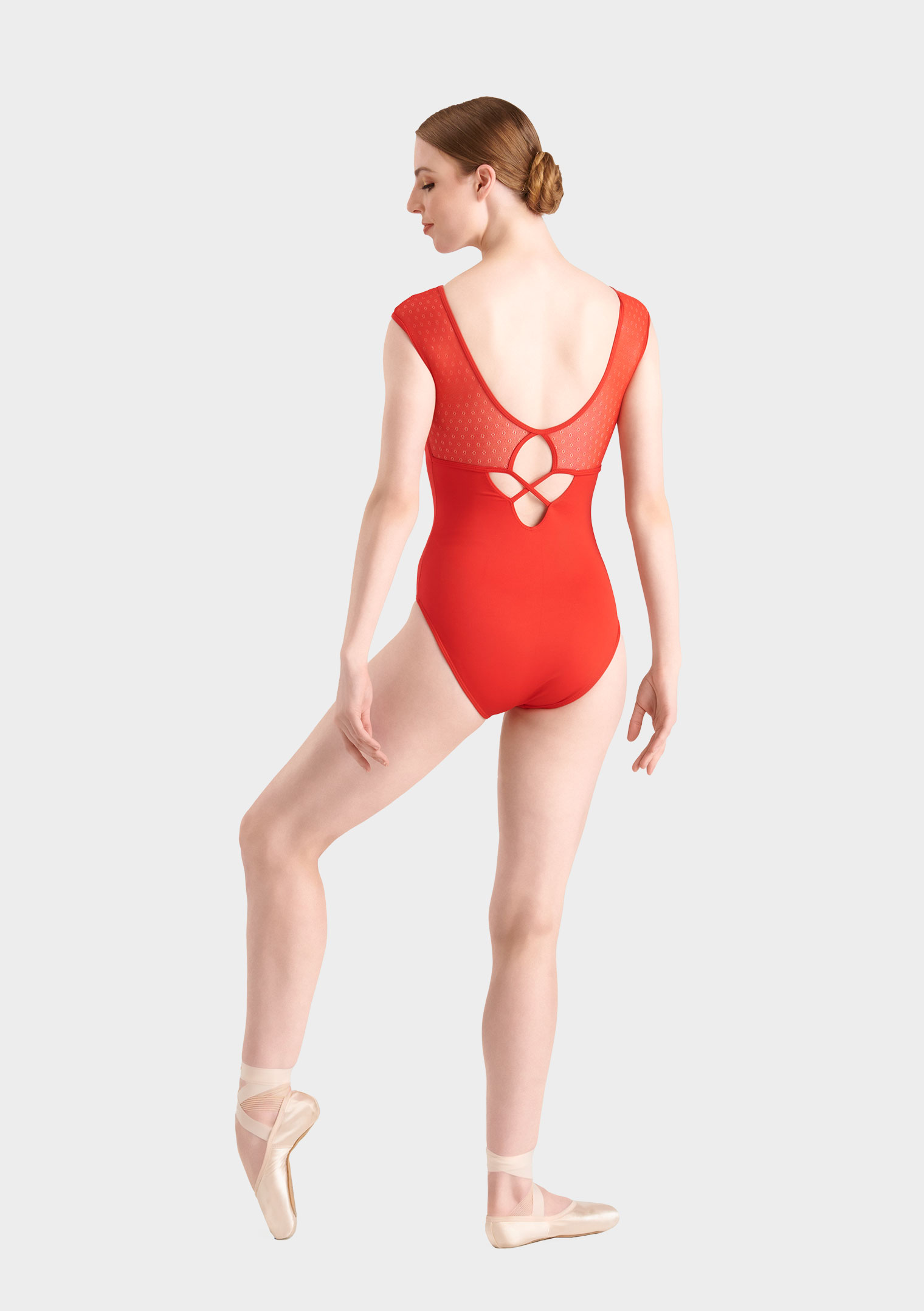 Simple and elegant cap sleeve leotard with scooped neckline, and gorgeous detail at the back with keyhole crossed straps.