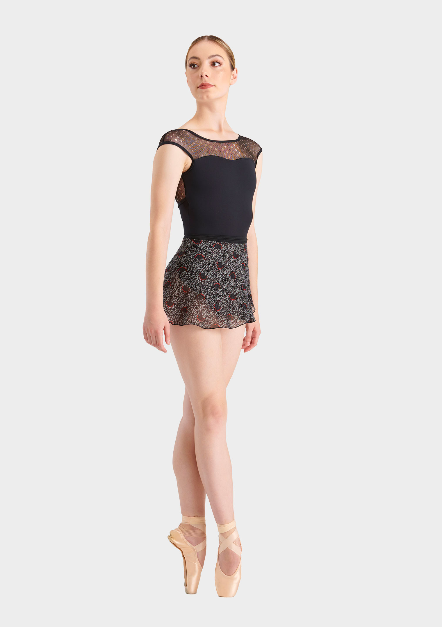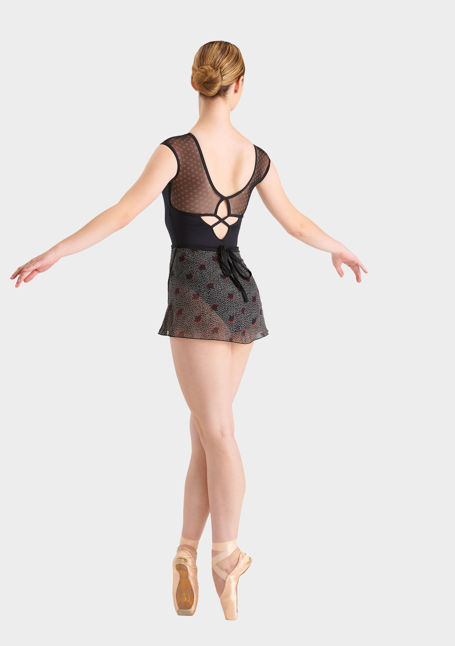Short wrap skirt, crosses over at the front and ties at the back, featuring an abstract black, red and white print.