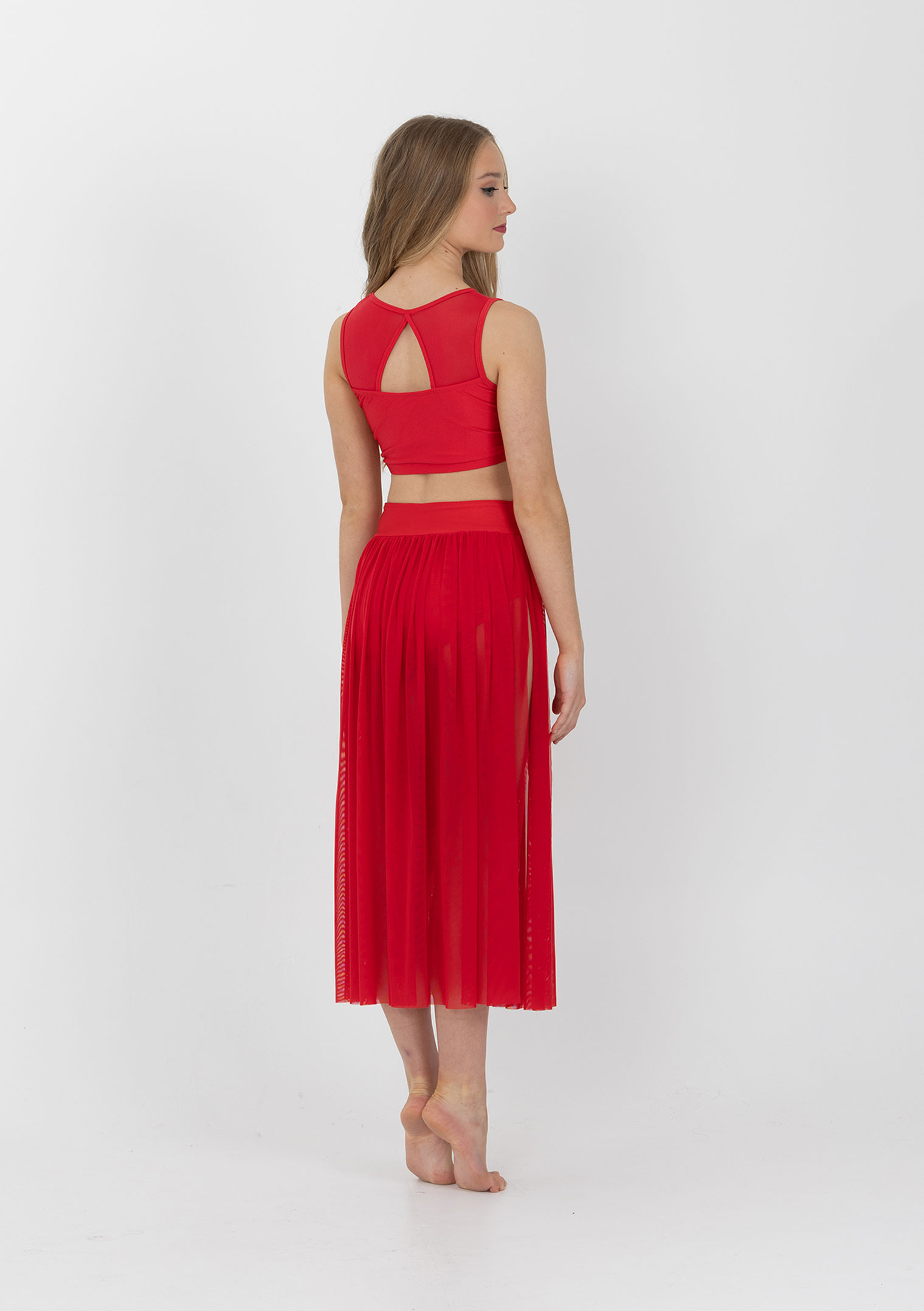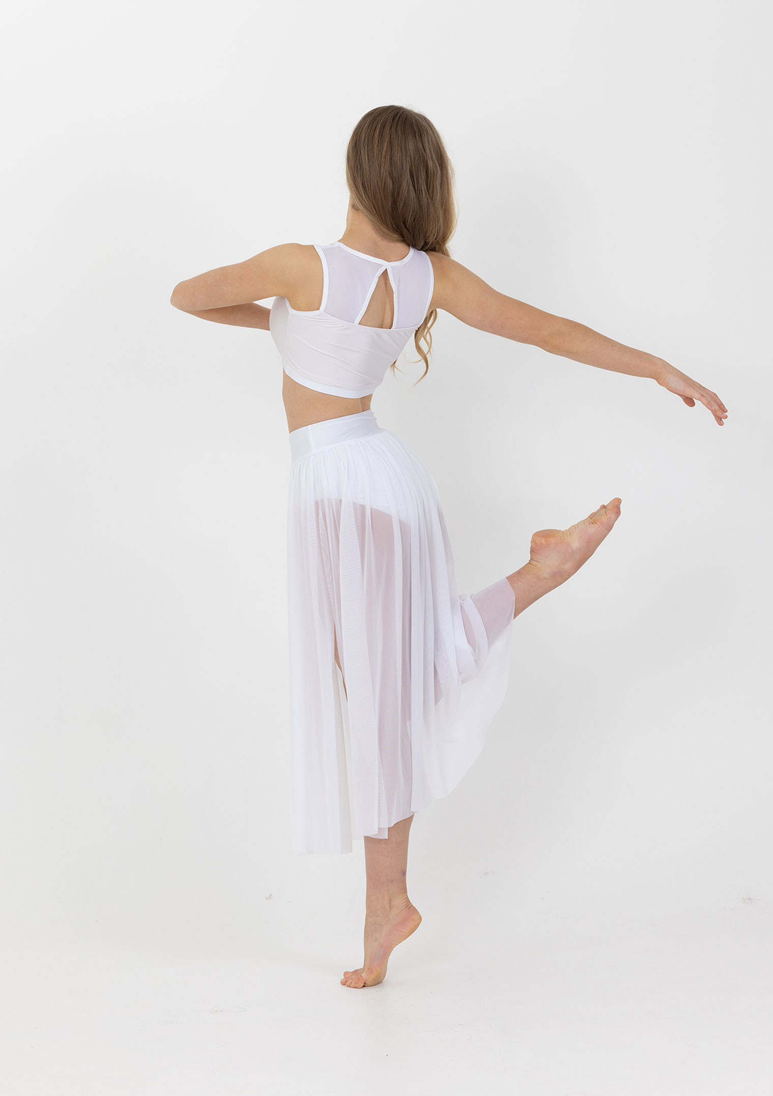 This exquisite split-leg mesh skirt with in-built brief, accentuates movement with its full-length design.